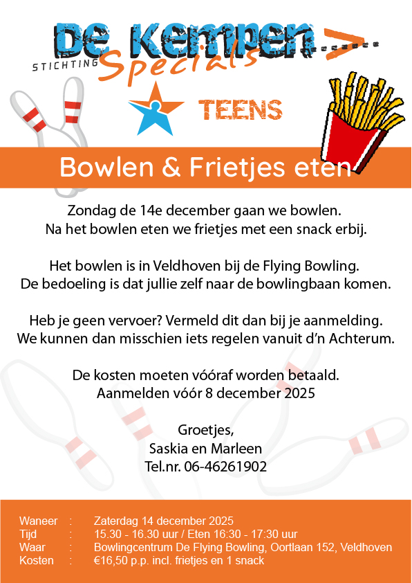 Zondag de 14e december gaan we bowlen. Na het bowlen eten we frietjes met een snack erbij.