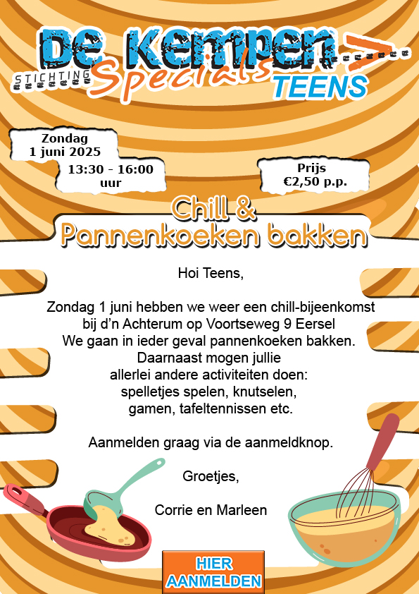 Zondag 1 juni hebben we weer een chill-bijeenkomst. We gaan in ieder geval pannenkoeken bakken.