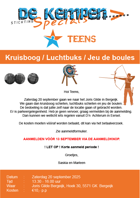 Hoi Teens, Zaterdag 20 september gaan we naar het Joris Gilde in Bergeijk. We gaan dan kruisboog schieten, luchtbuks schieten en jeu de boulen. De bedoeling is…