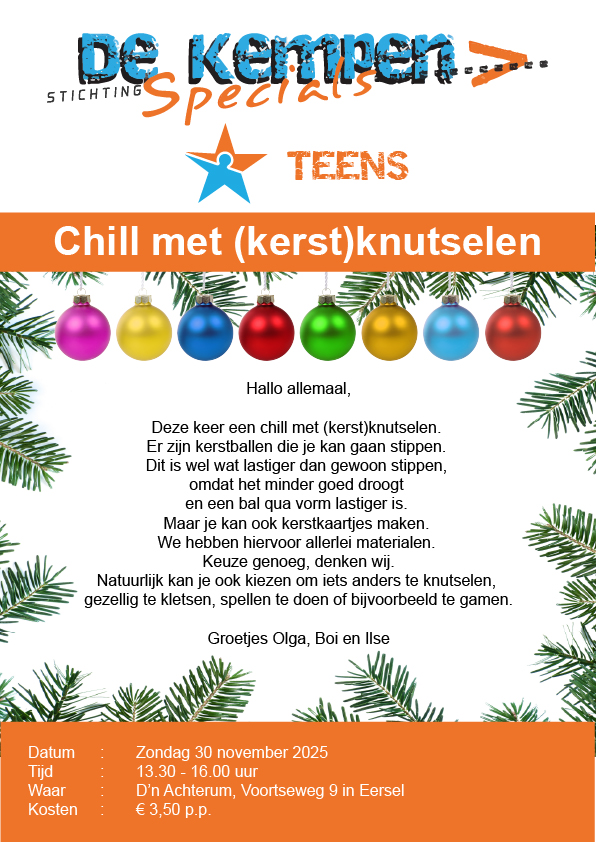 Deze keer een chill met (kerst)knutselen. Er zijn kerstballen die je kan gaan stippen. Dit is wel wat lastiger dan gewoon stippen, omdat het minder goed droogt en een bal qua vorm lastiger is. Maar je kan ook kerstkaartjes maken. We hebben hiervoor allerlei materialen. Keuze genoeg, denken wij.